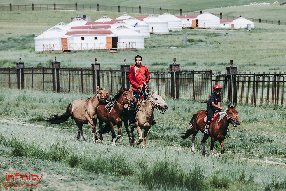 Ritorno verso Bonid e il parcheggio. Gli chiedo di accostare appena fuori l’ingresso principale. C’è una una piccola collinetta proprio lì davanti. Chissà che vista da li. Il tempo di scendere e odo l’inconfondibile tambureggiare di zoccoli al galoppo. Sono quattro cavalli di corsa. Sulle staffe del primo in piedi un uomo. Maglia rossa fiammante, aperta sul petto. Le briglie degli altri due in mano. Appena qualche metro più indietro il cavallo più piccolo del quartetto, non più di puledro. Sulla sella un bambino anch’esso in piedi sulle staffe. Un antico detto dice che un mongolo senza cavallo è come un uccello senza ali. Qui cavalli e cavalieri formano un binomio indissolubile. Vorrei avvicinarmi parlarci. Scambiare anche solo un complimento breve come la parola bello, goi. Se potessero rispondere mi direbbero che i bambini figli dei nomadi imparano fin dall’infanzia a cavalcare. Che i cavalli diventeranno i loro compagni di giochi. E che a differenza di quanto si possa immaginare questo non servirà per riconoscere i futuri bravi cavallerizzi, ma per distinguere i cavalli migliori. Li vedo sparire all’orizzonte in una nuvola di polvere diretti chissà dove.